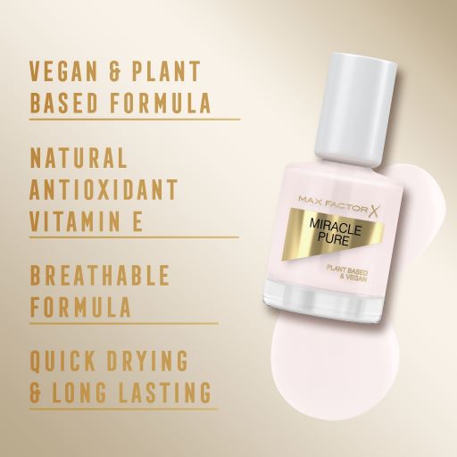 A miracle is at your fingertips! Max Factor Miracle Pure Nail Colour promotes healthy looking nails and gives vibrant colour with no compromise durability. The breathable 100% vegan formula is powered by plant-based ingredients, including mineral clay that promotes strength and natural antioxidant Vitamin E. Available in a range of shades, from deep red to calming pastels, Miracle Pure Nail Colour is quick-drying, long-lasting and gives a high shine finish whatever tone you pick.