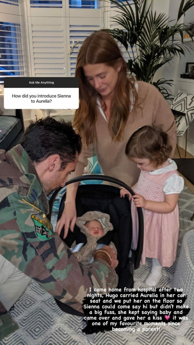 Recalling the special moment, Millie explained, “I came home from the hospital after two nights, Hugo carried Aurelia in her car seat and we put her on the floor so Sienna could come say hi but didn’t make a big fuss.”