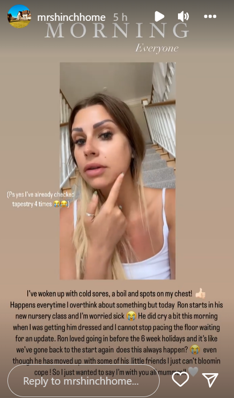 Sophie wrote a caption going into more detail on the video that read, “I’ve woken up with cold sores, a boil, and spots on my chest! Happens everytime I overthink about something but today Ron starts in his new nursery class and I’m worried sick”.