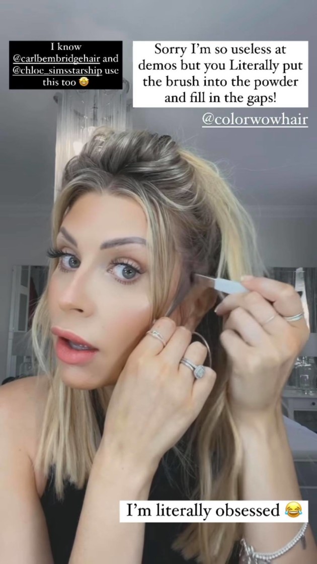 The 30-year-old mum then went on to show us her go-to beauty product which she uses to cover up her thin roots. That being Color Wow Hair’s root cover up product in the shade medium brown.