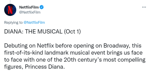“Debuting on Netflix before opening on Broadway, this first-of-its-kind landmark musical event brings us face to face with one of the 20th century’s most compelling figures, Princess Diana,” Netflix’s announcement Tweet read.