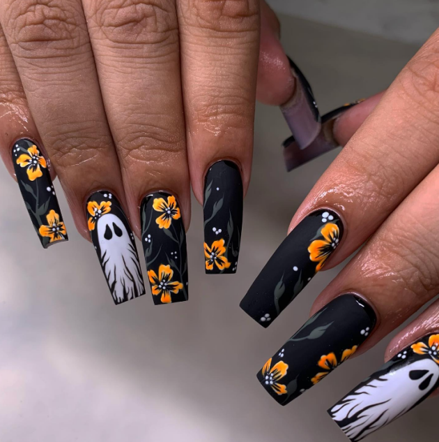 If you don’t fancy having extremely detailed nails for Halloween, then how about something a bit more subtle? We think these nails are the ideal mix of Halloween and autumnal sweetness. The orange autumn flowers are such a beautiful design, and the subtle ghosts will bring that spooky edge that you’re craving this Halloween season.
