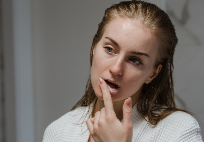 Then, when the mixture has been formed, lather it onto your lips with your finger and gently exfoliate with circular motions to remove any dead skin and soften ridges.