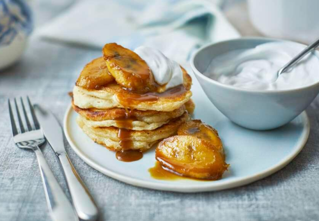 Serve 3 warm pancakes per person with some of the bananas, drizzling over any remaining caramel from the pan. Finish with a dollop of coconut yogurt.