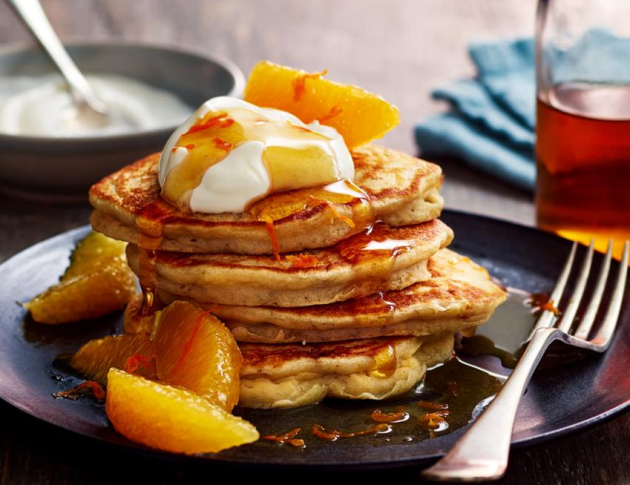 Top the pancakes with the yogurt, orange zest and segments, then drizzle with maple syrup and any reserved orange juice.
