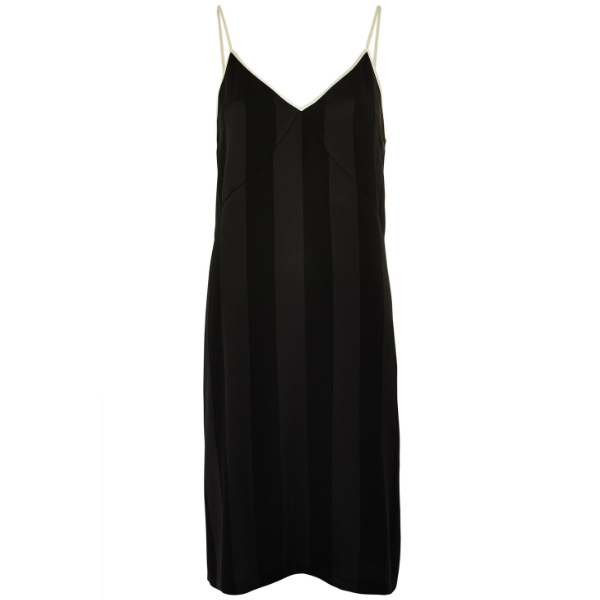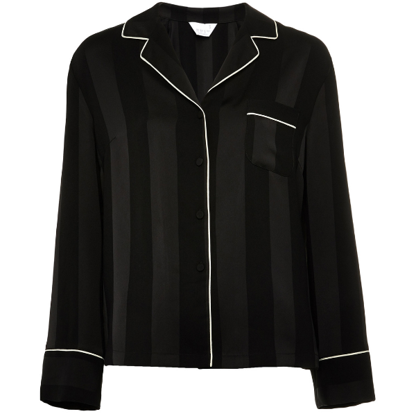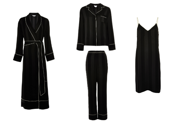 The full luxury set includes a black satin twill long-sleeve striped shirt with matching long bottoms, each priced separately at €14, along with a swish black satin twill chemise, with a gold satin trip along the straps and neckline, also priced at  €14.
