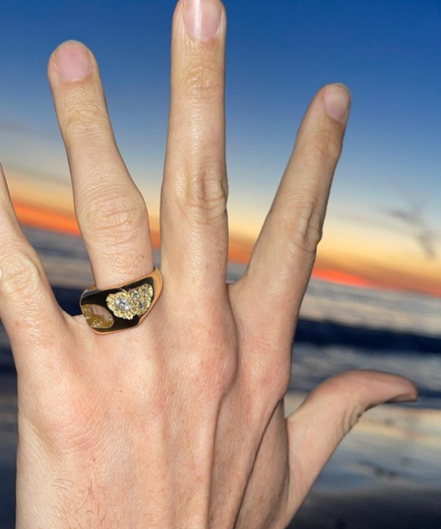 In other sweet snaps taken on the beach just after dusk, we get a real close up of Nick’s new bling, which features a thick gold band and interesting stone designs.