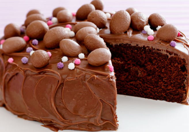 Place your cake on a plate or cake stand and simply smother it in your chocolate fudgy icing, then decorate with your mini eggs and sprinkles.