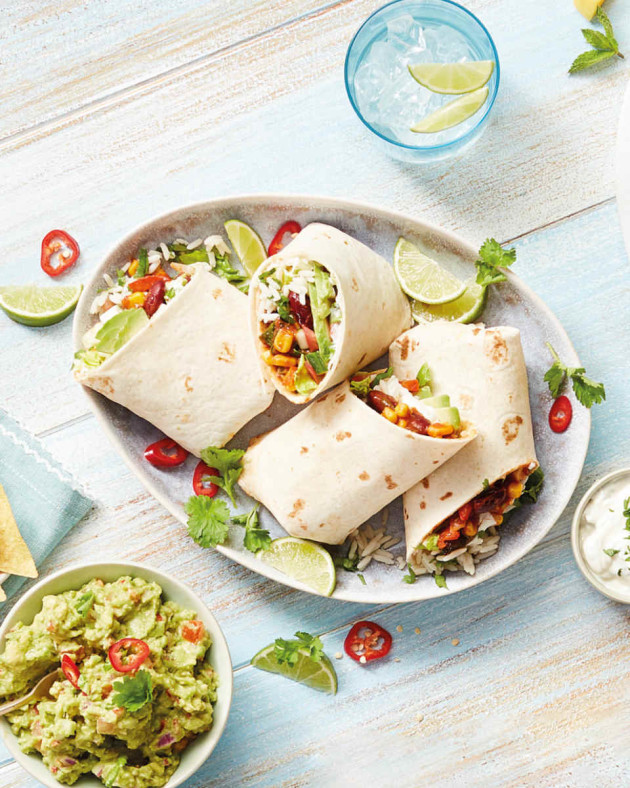 Fold over the edges then roll up the wraps to make the burritos and serve with fresh lime wedges.