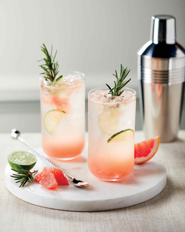 Put the grapefruit and lime juices together with the gin in a cocktail shaker, along with a sprig of rosemary and some ice cubes.