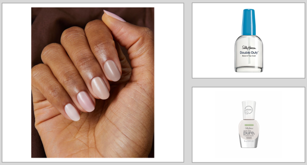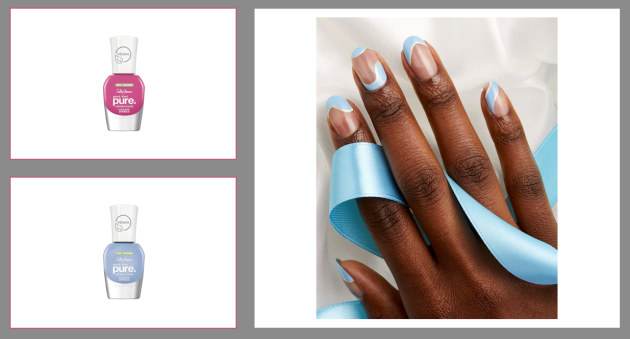 Sally Hansen Good.Kind.Pure Rose Petal is a great base and acts like a concealer for your nails, hiding any imperfections. Then choose your tip colour, I like a baby blue so would pick up Sally Hansen Good.Kind.Pure in Crystal Blue or go for a pop of Pink with Good.Kind.Pure. Peony Origins (RRP: €11.99 / £9.99) and then seal with the Sally Hansen Good.Kind.Pure Top Coat”, recommends Class.