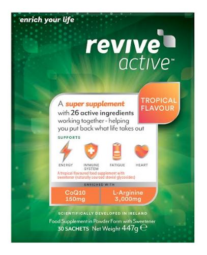 Revive Active Original and Tropical Flavour (€59.95): Specifically designed for individuals over the age of 35, these supplements contain 26 active ingredients, targeting cellular energy, immune support, energy levels, brain function, reduction in fatigue, and heart health.