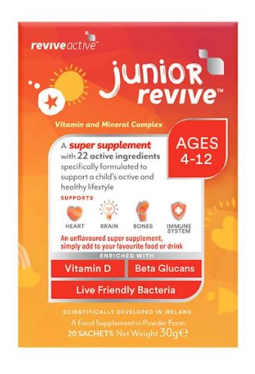 Junior Revive (€18.95): An unflavoured super supplement for children aged 4–12, ideal for fussy eaters and those always on the move, containing 22 active ingredients.