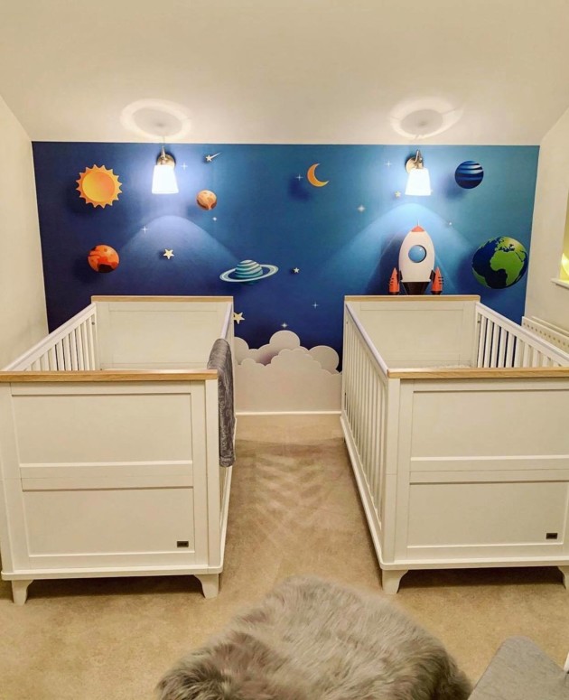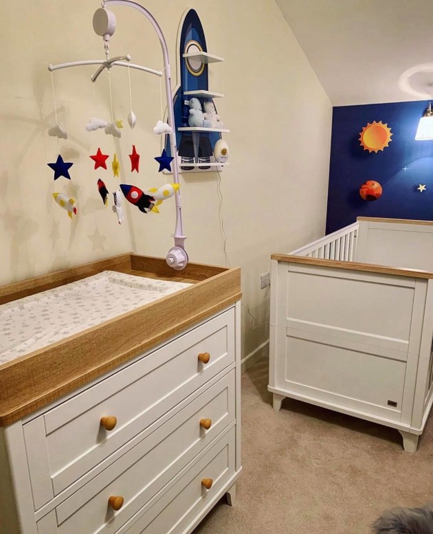 Rosanna chose a set of white and oak cots for her twins, and a matching changing table, all from the brand mamas & papas. The mum-to-be has created an elaborate 3D space themed feature wall, painted dark blue with two wall lights attached, to hang over each bed.