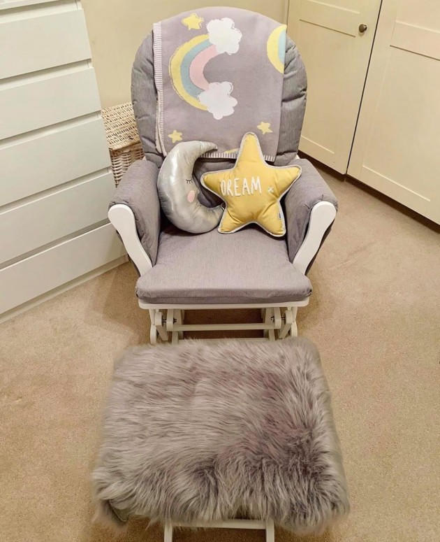 The expecting mum seems to be extra prepared, with her rocking nursing chair from the brand babylo, all ready to go with it’s matching footstool, a furry grey throw from Next, and a couple of star and moon cushions.