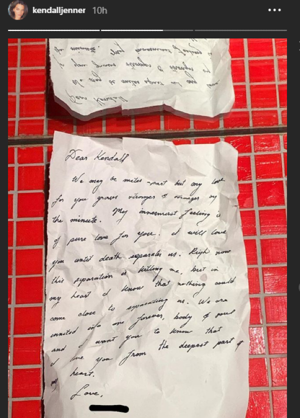 It starts off with: “Dear Kendall, we may be miles apart but my love for you grows stronger & stronger by the minute. My innermost feeling is love for you.”