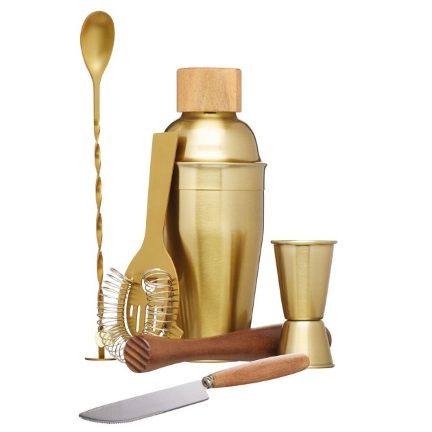What is a drinks cart without a cocktail set! Cocktail shakers, strainers and stirrers are the basics of any cocktail cart worth its salt, and it tells your guests you know what you’re doing. This Meadows and Byrne gold 6 Piece Cocktail Set contains everything you need to make your favourite cocktails at home and is the ideal play piece for any cocktail connoisseur! The set includes a 450 ml stainless steel cocktail shaker with an acacia wood lid, dual spirit measuring jug, wooden muddler, bar knife, mixing spoon, cocktail strainer and a recipe book – everything you need to get you started!