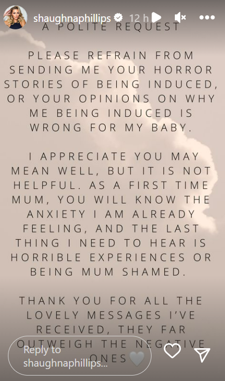 Shaughna Phillips has pleaded with her fans to stop sending their ‘horror induction stories’ and negative opinions on the procedure following a pregnancy update she shared yesterday.