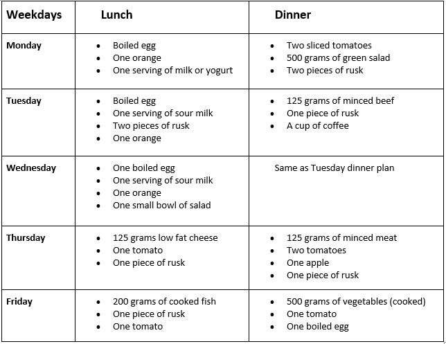 The meal plan with a shock diet is generally based on the 5-2 model, i.e., you follow a strict diet for five days and then eat regular foods for two days. However, the breakfast remains the same for all 14 days.