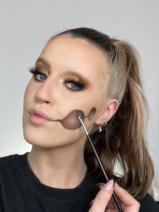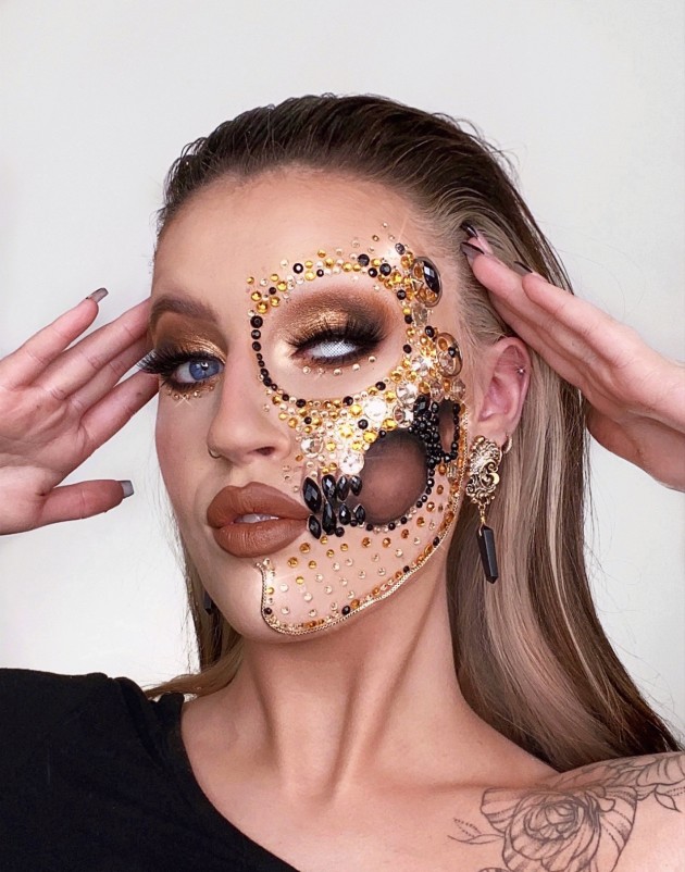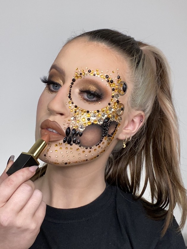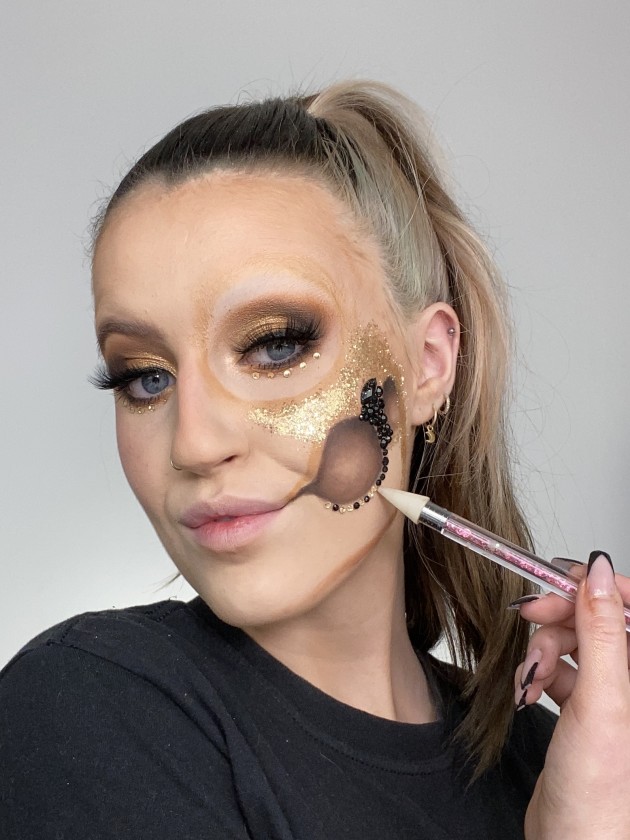 Start applying your gems using eyelash glue to your face in the shape of a skull. Again, Keilidh is basing this look off the tones in the Secret Treasure Eyeshadow Palette, so is using different shades of gold and black gems.