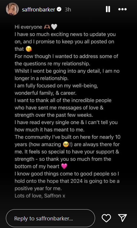 Barker closed off by saying, “I know good things come to good people so I hold onto the hope that 2024 is going to be a positive year for me. Lots of love, Saffron x”.