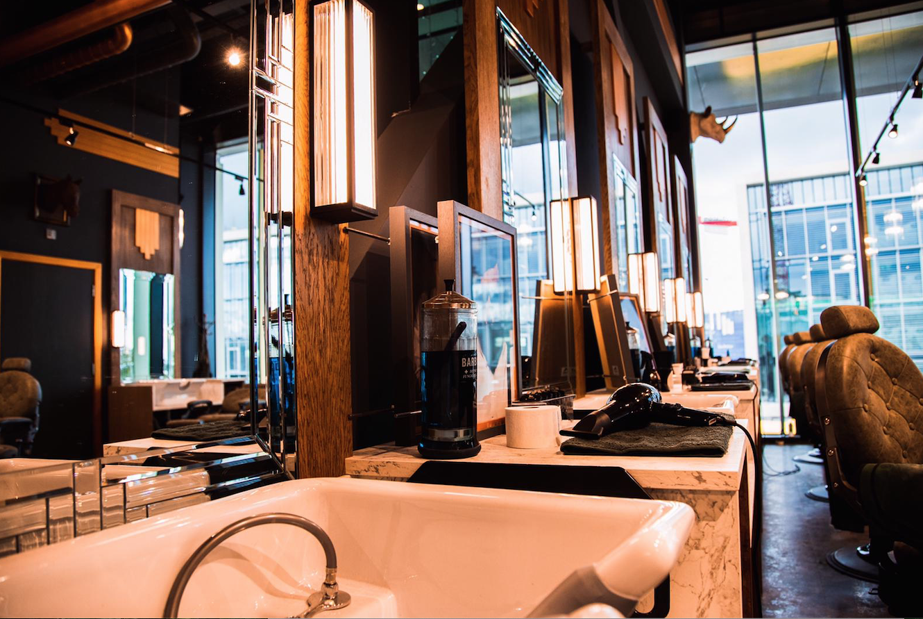 Sugar Daddy Barbers first Blackrock store boasts a large communal cutting area, that pays homage to the style moderne movement with art deco design features throughout. The Shop hosts eight cutting stations, all lined with vintage 16th-century style barber chairs that give the state-of-the-art shop a classical and premium feel. To the back of the shop are floor to ceiling windows that overlook Dublin bay providing you with stunning views while you wait. The front of the shop is a homely coffee-cum-whiskey bar, stocked with ‘Prizefight Whiskey’, the main ingredient of Sugar Daddy’s signature Old Fashioned cocktail, as well as Five Lamps Lager, both complimentary with every service.