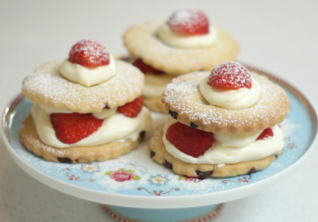 Whip the cream and icing sugar to soft peaks using a mixer. To assemble, place a biscuit on a plate and spoon some cream onto the biscuit. Add some strawberries, then spoon another bit of cream on top, then top with another biscuit.