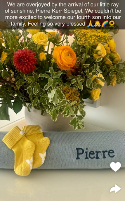 The 40-year-old captioned the post, “We are overjoyed by the arrival of our little ray of sunshine, Pierre Kerr Spiegel”.