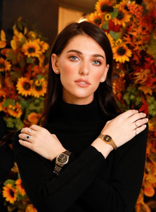 Pictured Ciara wears Polo neck €46 from Carraig Donn, with Tommy Hilfiger Watch €159, Casio Retro Watch €60, Sapphire Ring €3795, Solitaire Lab Diamond €4,800, Solitaire Lab Halo €3,500 and Emerald Cut Lab Diamond €4,500, from David Cullen Jewellers.