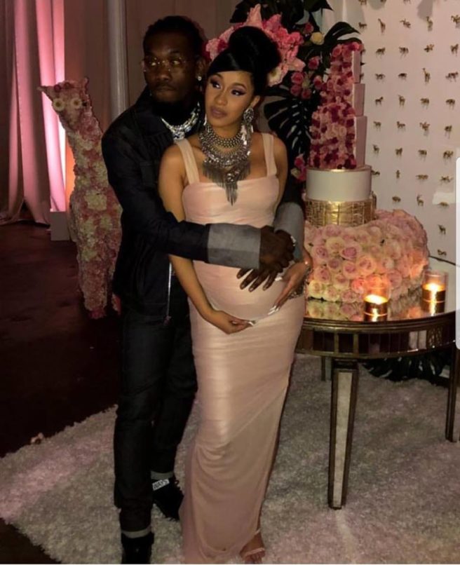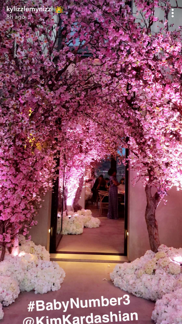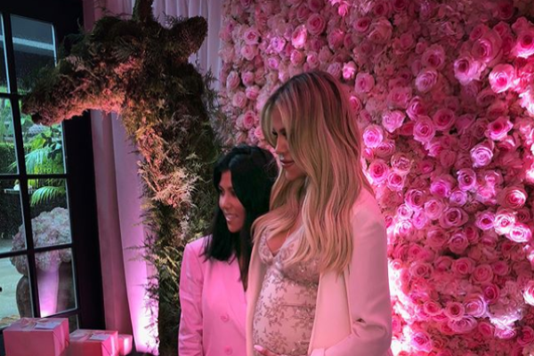 She was rocking a pale pink jumpsuit that hugs her eight-month baby bump, while pink and blue balloons are carefully spaced in decorative arches and on tables throughout the baby shower.