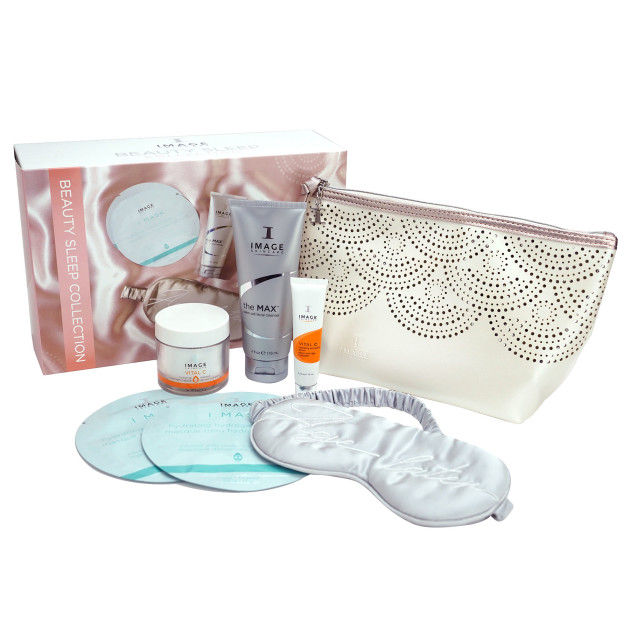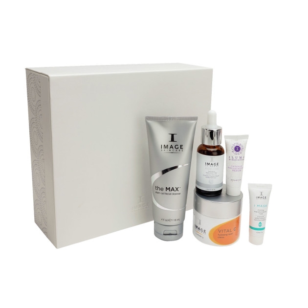 The collection includes the Image Skincare Max Stem Cell Facial Cleanser 118ml, Vital C Hydrating Overnight Mask 50ml, IMask Hydrating Hydrogel Sheet Mask x2, Vital C Hydrating Anti-Aging Serum 15ml and pretty sleep mask gift.