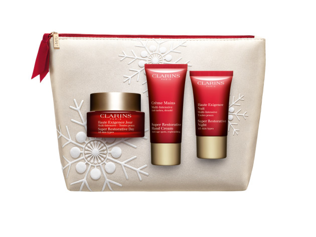 The Clarins Super Restorative Day Cream is included in this gift set in a 50ml size along with the Clarins Super Restorative Night Cream 15ml and Clarins Super Restorative Hand Cream 30ml – all presented in a large size 2019 holiday pouch.
