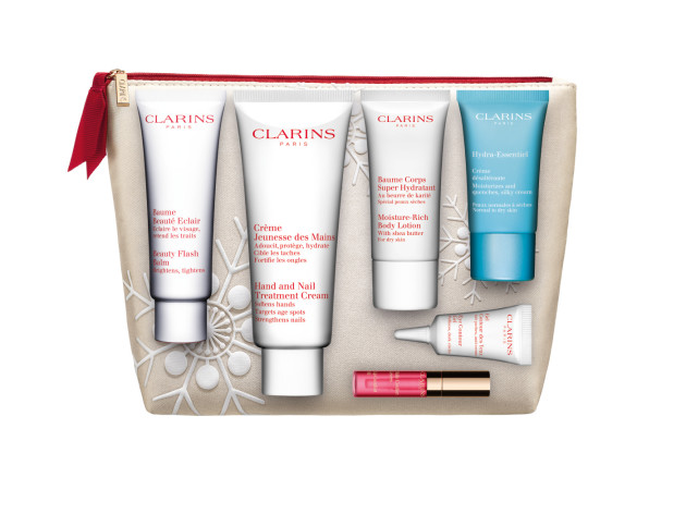 Along with the Clarins Beauty Flash Balm 50ml it also includes Clarins Hand & Nail Cream 100ml, Clarins Moisture Rich Body Lotion 30ml, Clarins Hydra Essential Cream 15ml, Clarins Eye Contour Gel 3ml and Clarins Lip Perfector 5ml – all presented in a large size 2019 holiday pouch.