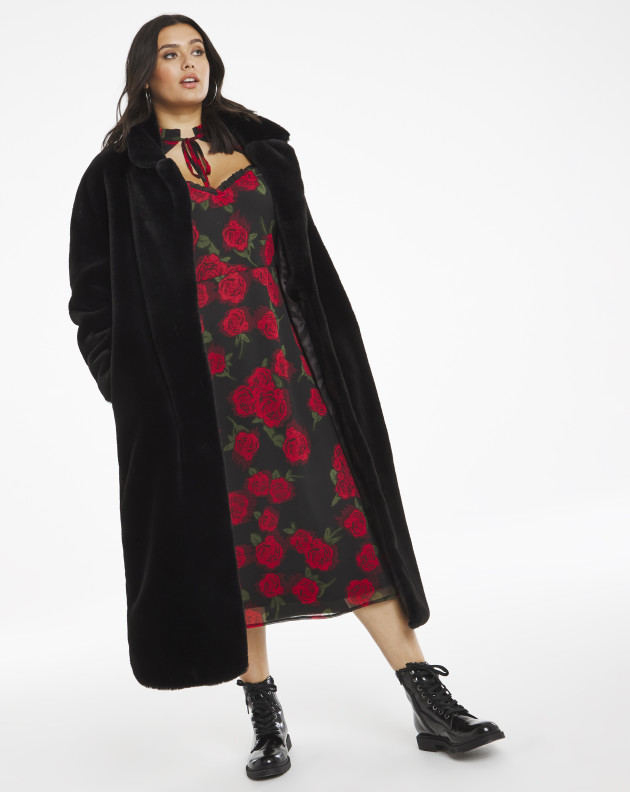 This totally chic longline faux fur coat in black is a style you won’t want to take it off. Stay cosy whilst still looking fabulous. The perfect piece to take you from day to night, whilst adding glamour to any outfit.