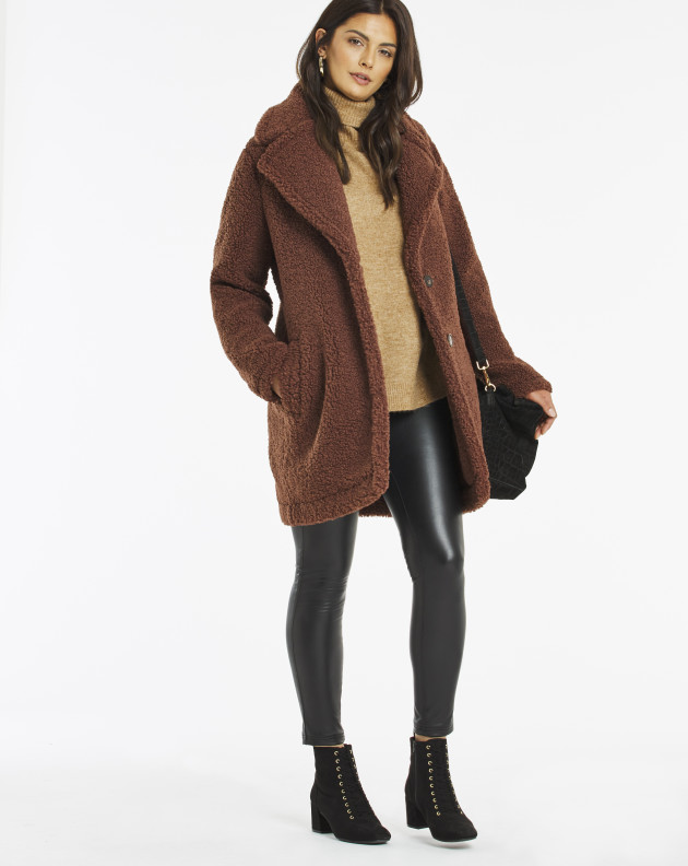 This brown teddy fur coat is a must have. In an updated flattering shape and new super soft teddy faux fur, this coat is perfect for cosying up this winter. Layer over almost any outfit as your go-to winter coat.
