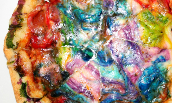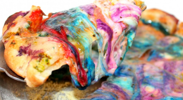 Well. we suggest you simply add a rainbow of food dye to cheese, and make a rainbow pizza… because why not?