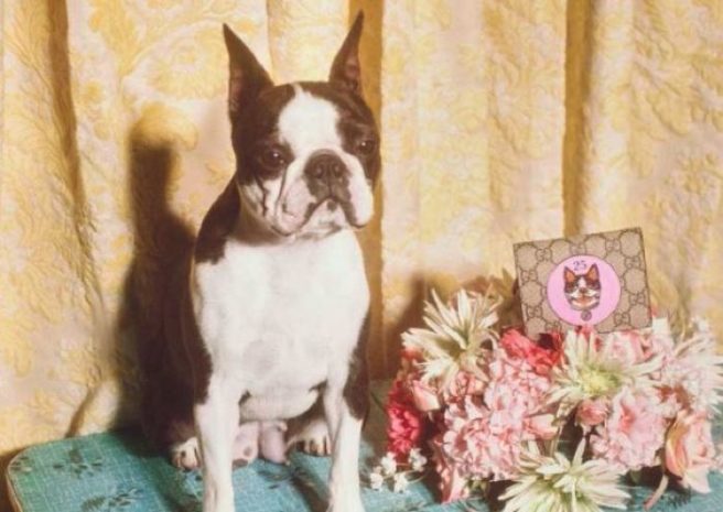 Inspired by a pillow given to Alessandro Michele by artist Helen Downie the dog motifs of Bosco and Orso, Creative Director’s Boston Terriers, appear on ready-to-wear pieces.