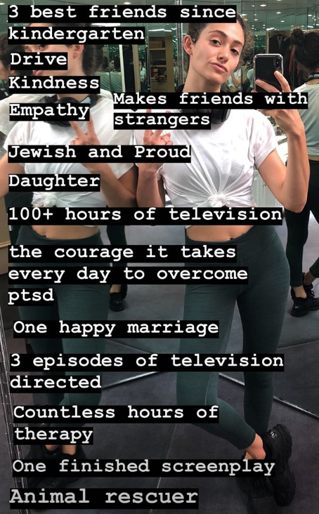 “Jewish and Proud,” “Drive,” “Animal Rescuer,” “100+ hours of television,” “One finished screenplay,” and “Countless hours of therapy” is splayed across her selfie.
