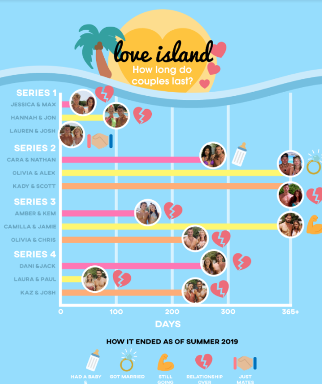 Watches2Ucreated a graph to depict how long the final three couples lasted within the first year of leaving the villa.
