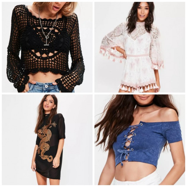 Crochet jumper €37.50, Playsuit €60.50, Dragon sheer dress €30.00, Blue lace-up top €18.00