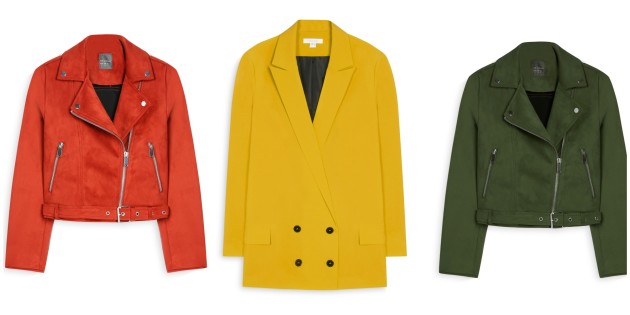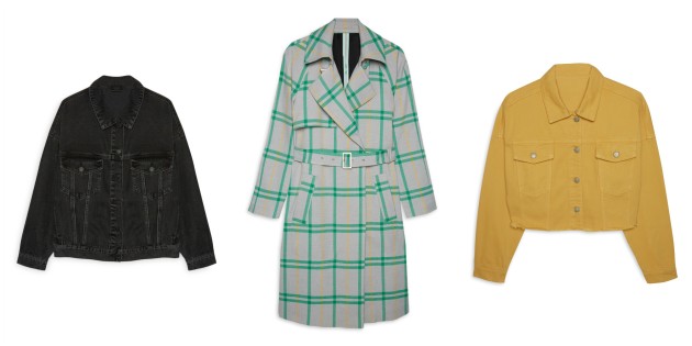 Black Oversize Denim Jacket €19.00, Green Stripe Longline Coat €40.00, Yellow Raw Hem Jacket €19.00