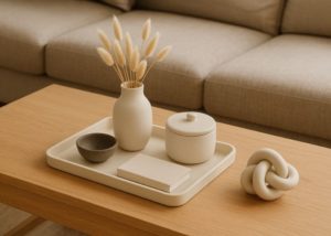 - Begin with a base. A tray instantly corrals small things. On shelves, a flat book stack works like a tray; on consoles, a simple runner breaks up long lines.