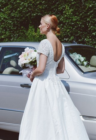 Like this Vintage 90's Embroidered Full Skirt Wedding Dress – a stunning throwback, this beautiful vintage wedding dress in immaculate condition. It has an embroidered bodice top with short sleeves and low back. A full skirt and train with matching embroidered detail. It is a gorgeous satin material and so beautifully elegant. Complete with underskirt and mesh. It is in a beautiful condition and has been fully dry cleaned.