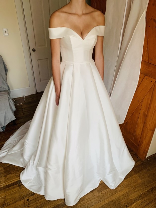 This Sophia Tolli comes in at €1,350, and it’s worth it for the pockets alone! The ballgown off-the-shoulder look is modern and classic and it’s never been worn as the owner decided to elope instead of doing the big wedding!