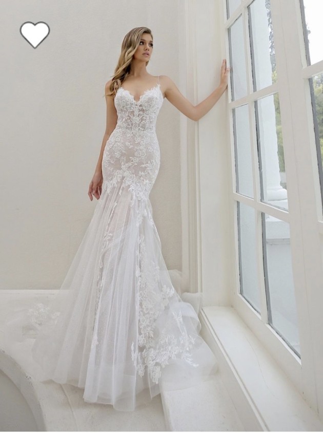 The Enzoani Magnolia come in at £1,100 as it has never been worn or altered. The mermaid style features a gorgeous train made of layers of mesmerising glitter tulle and lace. More glitter lines on the gown give an extra pop effect. Chantlily lace is used throughout the gown to finish this enchanting look.