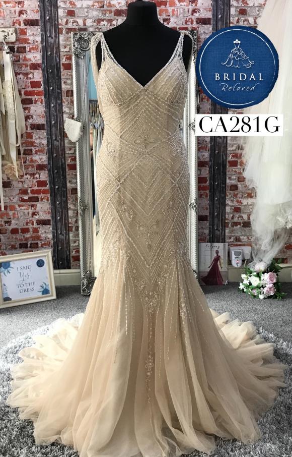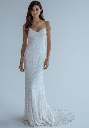 This Karen Willis dress is just one of their huge selection of gorgeous designer dresses and the ‘Lottie’ is a favourite all around. This one is a size 12, unworn sample that originally cost £1890, but you’ll only pay £900 – a bargain for this incredible sequined wedding dress featuring spaghetti straps and a V-neck.