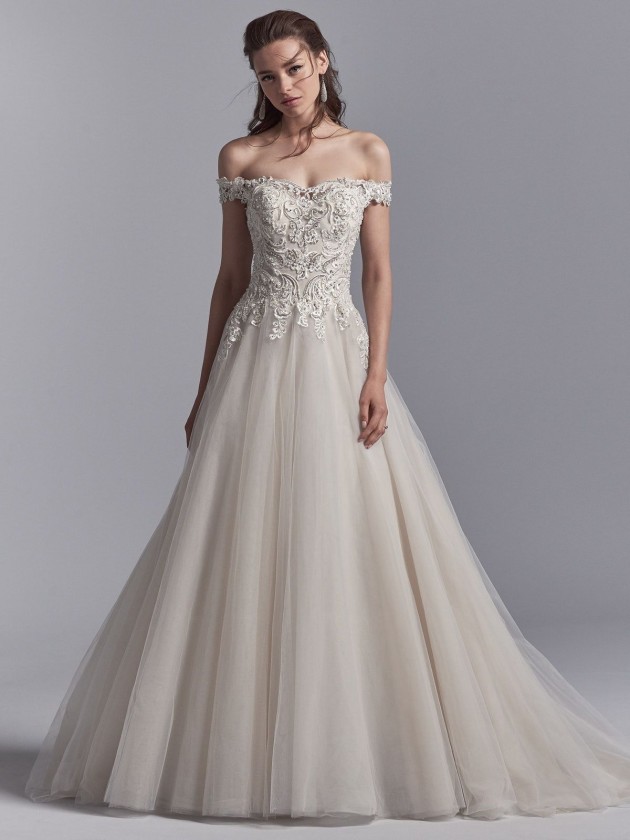 The Sottero and Midgley 'Safira' is just one of the beautiful gowns they have on display on their site. This dress is a beautiful ball gown, in excellent condition and only worn once. The bodice is beautifully embellished and accents the waist. The skirt has several flowing layers, with a medium-length train. Off-the-shoulder lace sleeves, a romantic flowy skirt and beautiful sparkly pearl beading, this is the dress for the bride who wants a fairytale wedding.