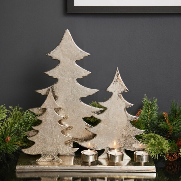 Bring a festive look to your interior with this elegant Christmas tree-shaped tealight holder. Its stylised design features a large, a medium and a small Christmas tree delicately placed on a textured silver base that can hold 3 tea candles. This eye-catching candle holder will be a family favourite for Christmas’s to come and continue to bring Christmas merriment to your home!