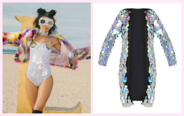 Faux Fur coat €92.00, Holographic sequin kimono €112.00