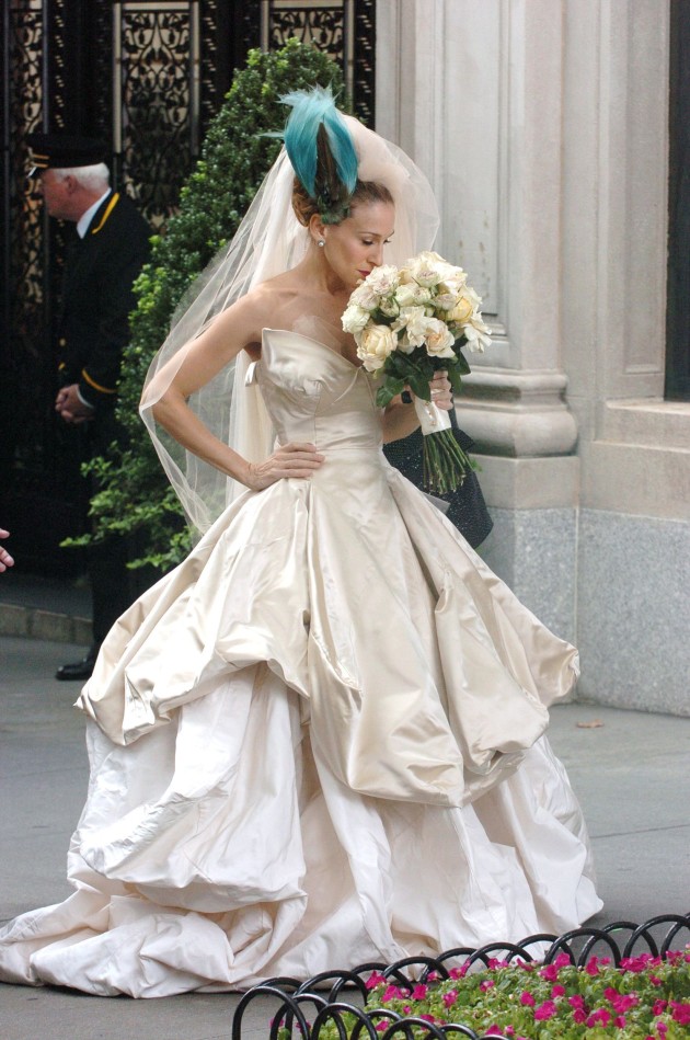 We can always count on Carrie to bring the drama! Gathered ivory swathes of fabric drape Parkers’ delicate frame, and the extended pointed bodice gives the whole look an almost oversized feel, not dissimilar to a Marie-Anotinette style look. The feathered statement blue headpiece with the frothy veil certainly give it a regal and overstated feel that is classic Carrie – now if only the wedding had worked out!
